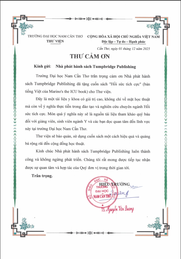 Thư cảm ơn — Thư viện Trường Đại học Nam Cần Thơ gửi tặng thư cảm ơn đến Tumpbridge Publishing.